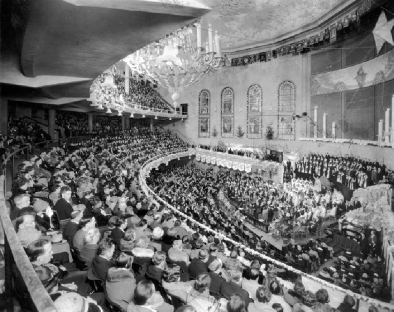 To better contextualize the challenges of the new century, John Nelson Darby of the Plymouth Brethren and an Irish Anglican minister, devised modern dispensationalism, an innovative Protestant theological interpretation of the Bible that found a ready audience among the Evangelicals who quickly incorporated the idea as a doctrine. Here, we might see an effort by Evangelicals to claim a foundational teaching of their own in an effort to break away from the mainline to legitimize their loose choosing of teachings from paternalistic denominations. According to scholar Mark S. Sweetnam, who takes a cultural studies perspective, dispensationalism can be defined in terms of its Evangelicalism, its insistence on the literal interpretation of Scripture, its recognition of stages in God’s dealings with humanity, its expectation of the imminent return of Christ to rapture His saints, and its focus on both apocalypticism and premillennialism. Cyrus Scofield further promoted the influence of dispensationalism through the explanatory notes to his Scofield Reference Bible. Additionally during the 19th century, megachurches, churches with more than 2,000 people began to develop. The first evangelical megachurch, the Metropolitan Tabernacle, a 6000-seat auditorium, was inaugurated in 1861 in London by Charles Spurgeon while Dwight L. Moody founded the Illinois Street Church in Chicago. These new revivalists were making strides to advance Evangelicalism as a rival and distinct challenge to the Reformed Churches.