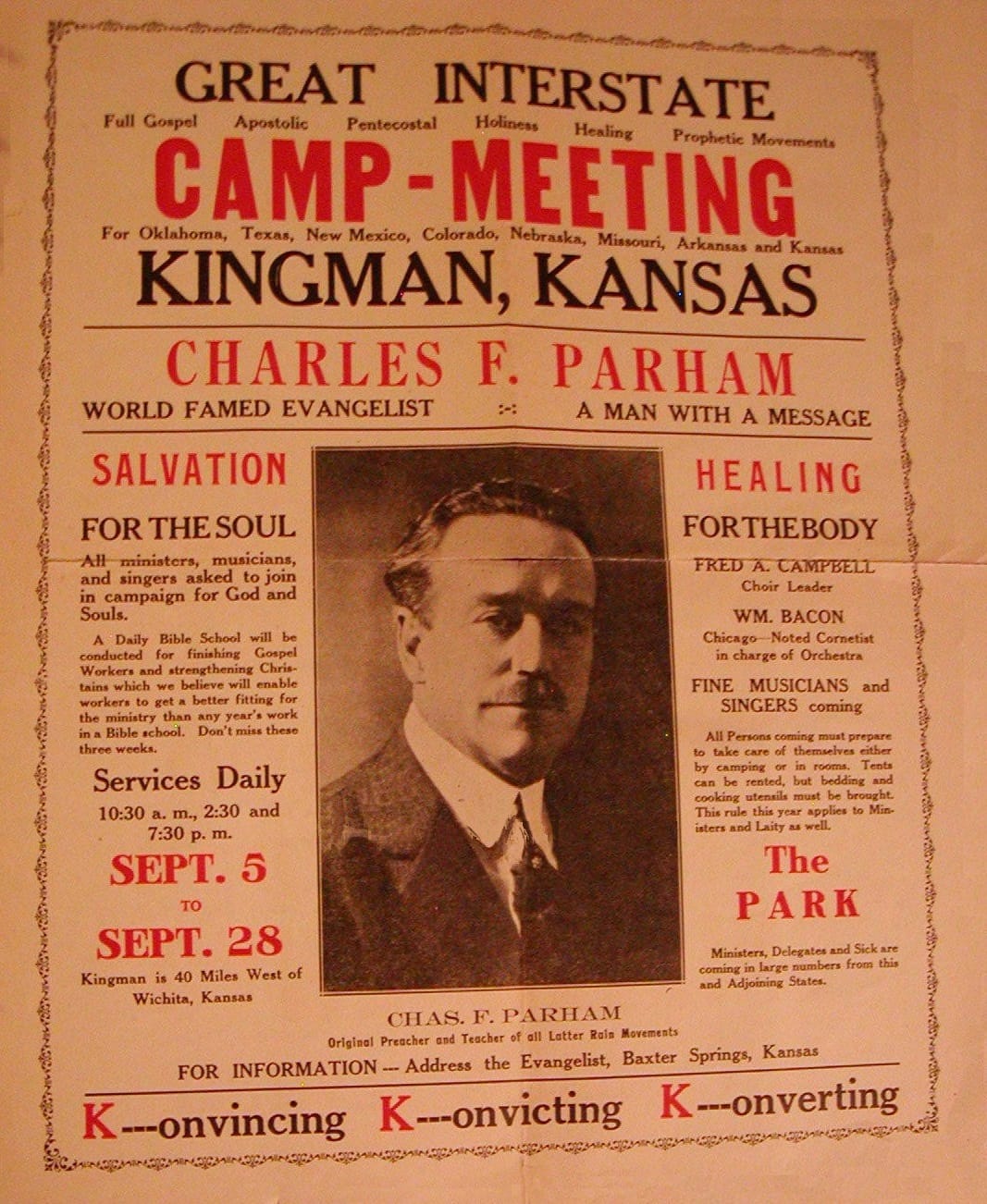 According to his wife Sarah’s biography of him, published after his death in 1930, Parham was very aware of the time and context in which he lived. In Kansas, churches were built in “hard-scrabble circuits… [where] ministry seemed generally to be considered a great burden on society, which they don’t seem to be able to get rid of and which they are unwilling to support.” He took issue with the laziness of those in ministry, “of whom it is often said, they demand more salary than the school teacher and in return do the community little or no good; usually working about one-sixth of the time the teacher does.” Unlike the Methodists of his youth, Parham did not want to “sell” God or place demands upon people.