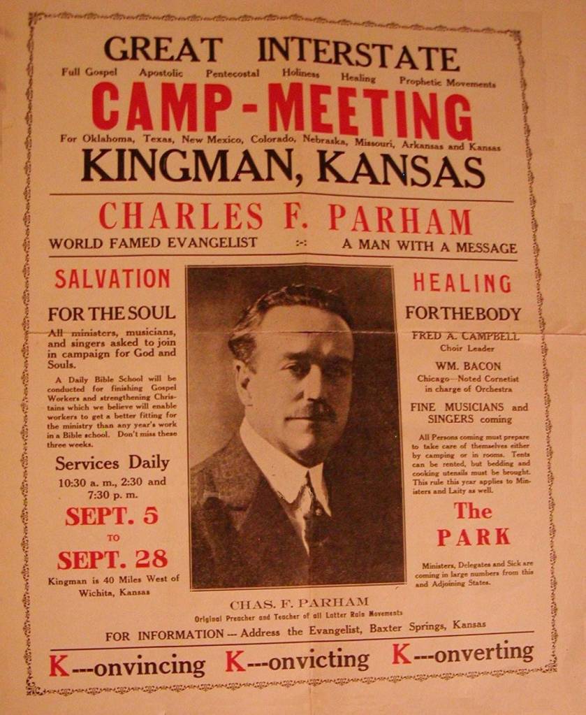 God’s activity was brief though. Parham’s controversial beliefs, unconventional and at times aggressive (“enthusiastic”?) style made finding support for his school difficult. After all, he solicited no funds and his students claimed to speak other languages but were unable to translate it. The local press ridiculed Parham’s Bible school, calling it “the Tower of Babel”, and many of his former students called him a fake. By April 1901, Parham’s ministry dissolved. It was not until 1903 that his fortunes improved when he preached on Christ’s healing power at El Dorado Springs, Missouri, a popular health resort. Mary Arthur, wife of a prominent citizen of Galena, Kansas, claimed she had been healed under Parham’s ministry. She and her husband invited Parham to preach his message in Galena, which he did through the winter of 1903–1904 in a warehouse seating hundreds. In January, the Joplin, Missouri, News Herald reported that 1,000 had been healed and 800 had claimed conversion. In the small mining towns of southwest Missouri and southeastern Kansas, Parham developed a strong following that would form the backbone of his movement for the rest of his life.