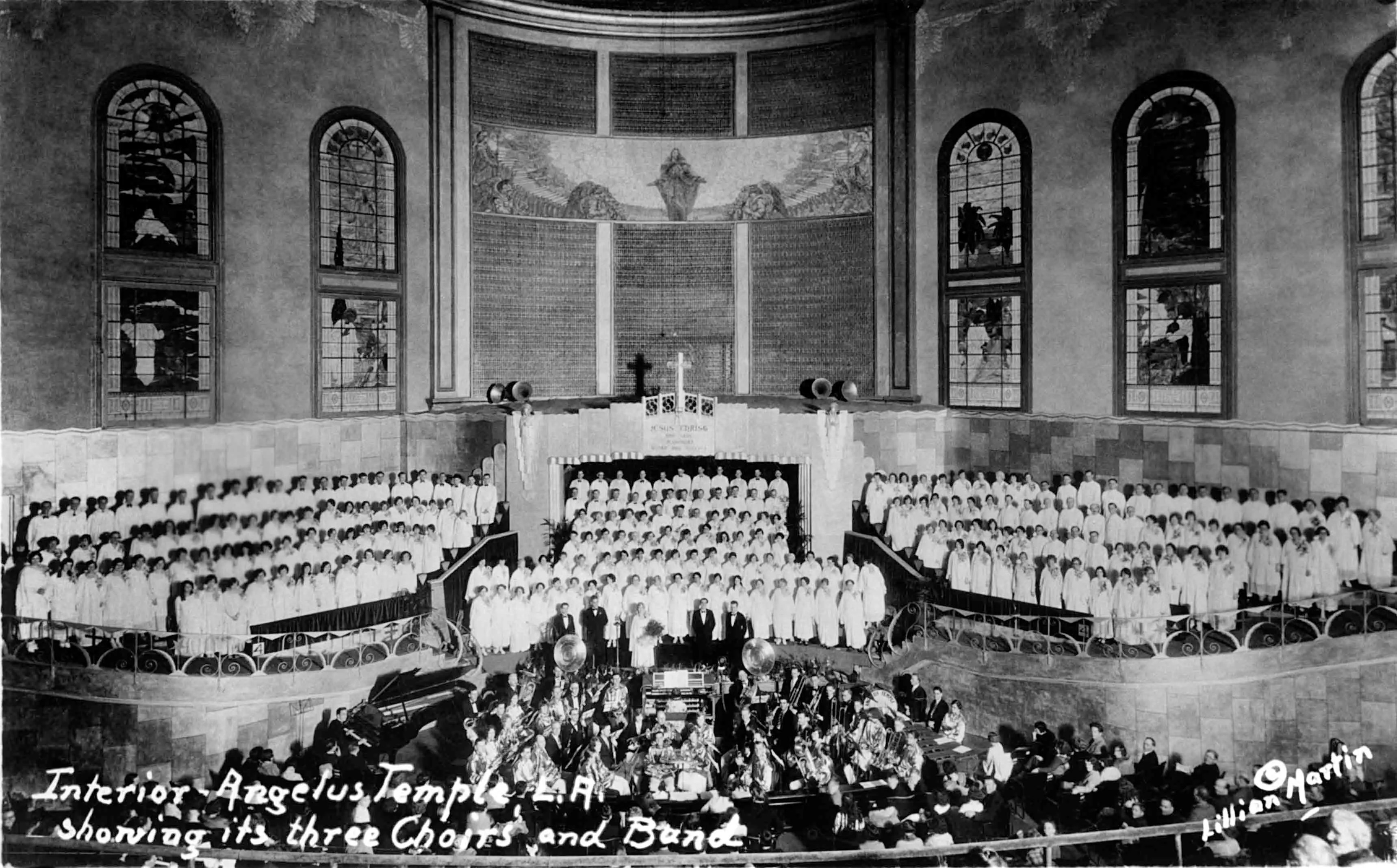 In Los Angeles, the Victoria Hall venue soon reached capacity and McPherson had to relocate to the 3,500 seat Temple Auditorium on Pershing Square, where people waited for hours to enter the crowded venue. These meetings were so impactful, it seems, that attendees were “led of the Lord” to build a home for her family, fulfilling the promise God had given McPherson when she left New York. For several years, she traveled and raised money for the construction of a large, domed church in Echo Park, named Angelus Temple, in reference to the Angelus bells and to angels. Not wanting to incur debt, McPherson found a construction firm willing to work with her as funds were raised “by faith”, beginning with $5,000 for the foundation. McPherson mobilized diverse groups to fund and build the church, by means such as selling chairs for Temple seating. Raising more money than expected though, McPherson altered the plans and built a “megachurch”, one of the first in the nation. Costs were kept down by donations of building materials and labor; the entire project cost contributors around $250,000, equivalent to almost $5.2 million today. Her large crowds had been promoted in church attendees with an church enrollment of over 10,000. Angelus Temple was advertised as the largest single Christian congregation in the world, and it was not hyperbole or inflated self-serving propaganda. According to church records, the Temple received 40 million visitors within the first seven years.