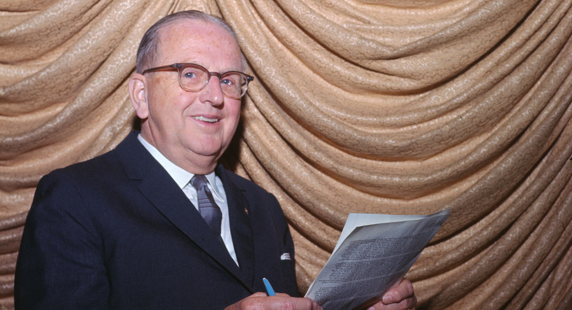 Unsurprisingly, after leaving Placentia Presbyterian, Fuller became a Baptist minister in 1925 and began pastoring a group that would become Calvary Church. It served as a launchpad for his radio ministry. By 1930, Fuller was regularly broadcasting Calvary’s Sunday school services as well as Bible study programs in the local area; eventually, the time he spent on the radio broadcast conflicted with the time he spent pastoring his church, so he either resigned or was more likely fired in 1933 when he formed the nonprofit Gospel Broadcasting Association to support his radio efforts. As the host and speaker of The Old Fashioned Revival Hour, a weekly Sunday radio broadcast that aired from 1937 to 1968, Fuller became a household name. The first nationwide broadcast occurred on October 3, 1937, on the Mutual Broadcasting System. During World War II, his messages of patriotism, personal salvation, and hard work gave hope to many disenfranchised Americans. Fuller’s sermons promoted self-determinism for listeners to pick themselves up by the bootstraps and work out their own salvation. The Old Fashioned Revival Hour broadcast was originally recorded in a Hollywood studio and in 1941, it moved to the Long Beach Municipal Auditorium in Long Beach, California. From 1941 through 1958, audiences attended services that were broadcast live on the radio from the Auditorium in the same way that Aimee Semple McPherson’s radio programs were live (or syndicated recordings of live) services. Live programs helped to capture the audience, assuring them that they were tuning into a real church service. Long after McPhersons disappeared from the airwaves, The Old Fashioned Revival Hour returned to a recording studio. There were new demands on Charles Fuller’s schedule, like the construction of Fuller Theological Seminary in Pasadena. The seminary opened in 1947 and Fuller’s son, Daniel Fuller, served the seminary as Dean and professor of hermeneutics for the next 50 years. Recording The Old Fashioned Revival Hour allowed the Fuller family to have more control over the narrative they were putting out; the program was noted for its music, featuring the Old Fashioned Revival Hour Choir and quartet, accompanied by organist George Broadbent and pianist Rudy Atwood with a more refined sound. In fact, the choir made several popular recordings in the 1940s and 1950s. Aided by his wife, Grace, The Old Fashioned Revival Hour program created a family-like atmosphere. In 1942, it attracted an audience of over 10 million listeners worldwide and in 1951, the program was carried on the ABC Radio Network, where it was heard on more than 650 radio stations making it the most popular religious radio program to that point.