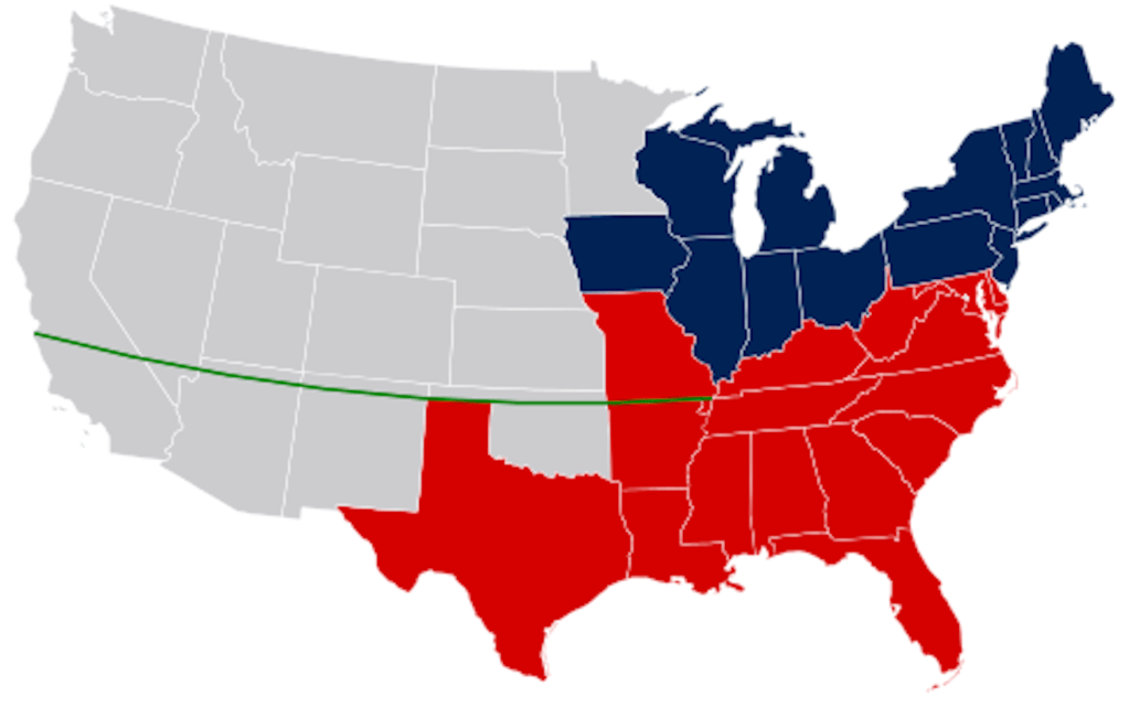 1820 – The Missouri Compromise was a legislative agreement that admitted Missouri as a slave state and Maine as a free state, preserving the Senate balance of 12 states each. It prohibited slavery in the Louisiana Territory north of the 36^30′ latitude line, temporarily easing sectional tensions over slavery’s expansion. The Missouri Compromise was controversial and many worried that the country had become lawfully divided along regional and sectarian lines. The Supreme Court declared it unconstitutional in Dred Scott v. Sandford (1857), both of which increased tensions over slavery and contributed to the American Civil War. The compromise both delayed the Civil War and sowed its seeds; in April 1820, Thomas Jefferson predicted the line as drawn would someday tear the Union apart. Forty years later, the North and South would split closely along the 36°30′ parallel and launch the Civil War.