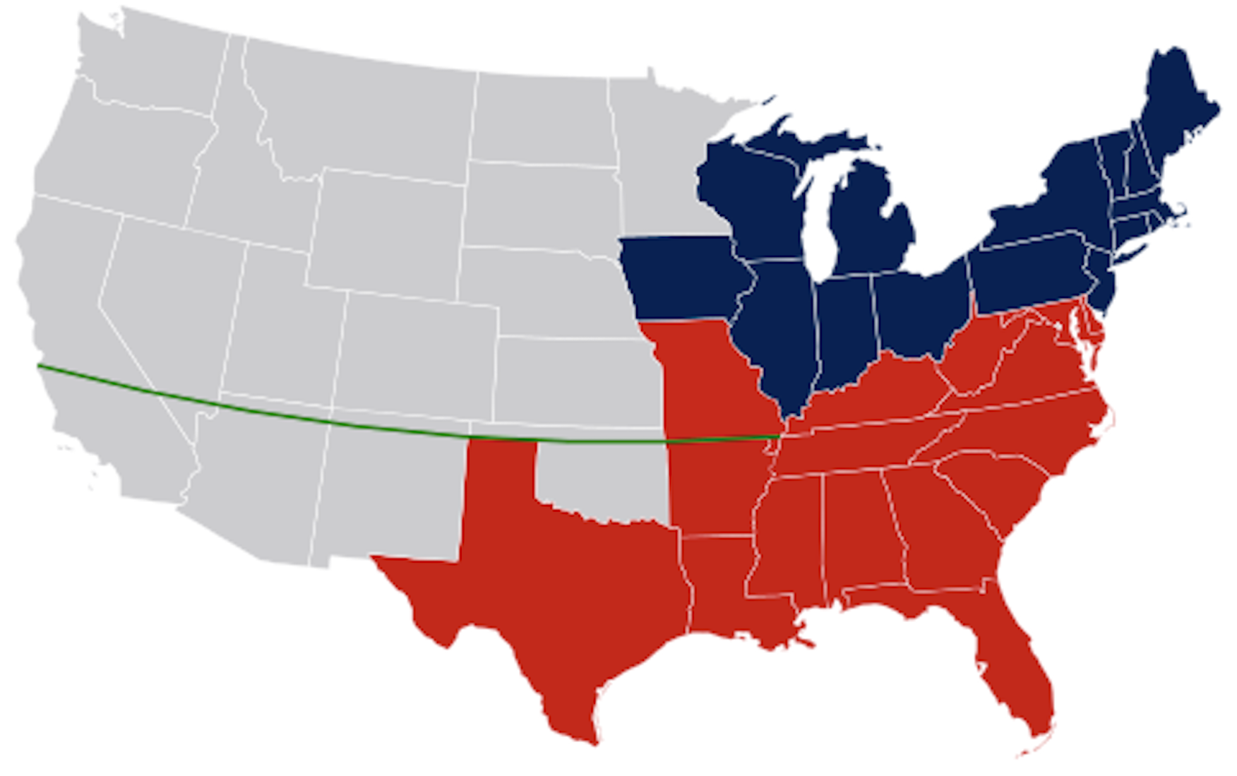 1820 – The Missouri Compromise was a legislative agreement that admitted Missouri as a slave state and Maine as a free state, preserving the Senate balance of 12 states each. It prohibited slavery in the Louisiana Territory north of the 36^30′ latitude line, temporarily easing sectional tensions over slavery’s expansion. The Missouri Compromise was controversial and many worried that the country had become lawfully divided along regional and sectarian lines. The Supreme Court declared it unconstitutional in Dred Scott v. Sandford (1857), both of which increased tensions over slavery and contributed to the American Civil War. The compromise both delayed the Civil War and sowed its seeds; in April 1820, Thomas Jefferson predicted the line as drawn would someday tear the Union apart. Forty years later, the North and South would split closely along the 36°30′ parallel and launch the Civil War.